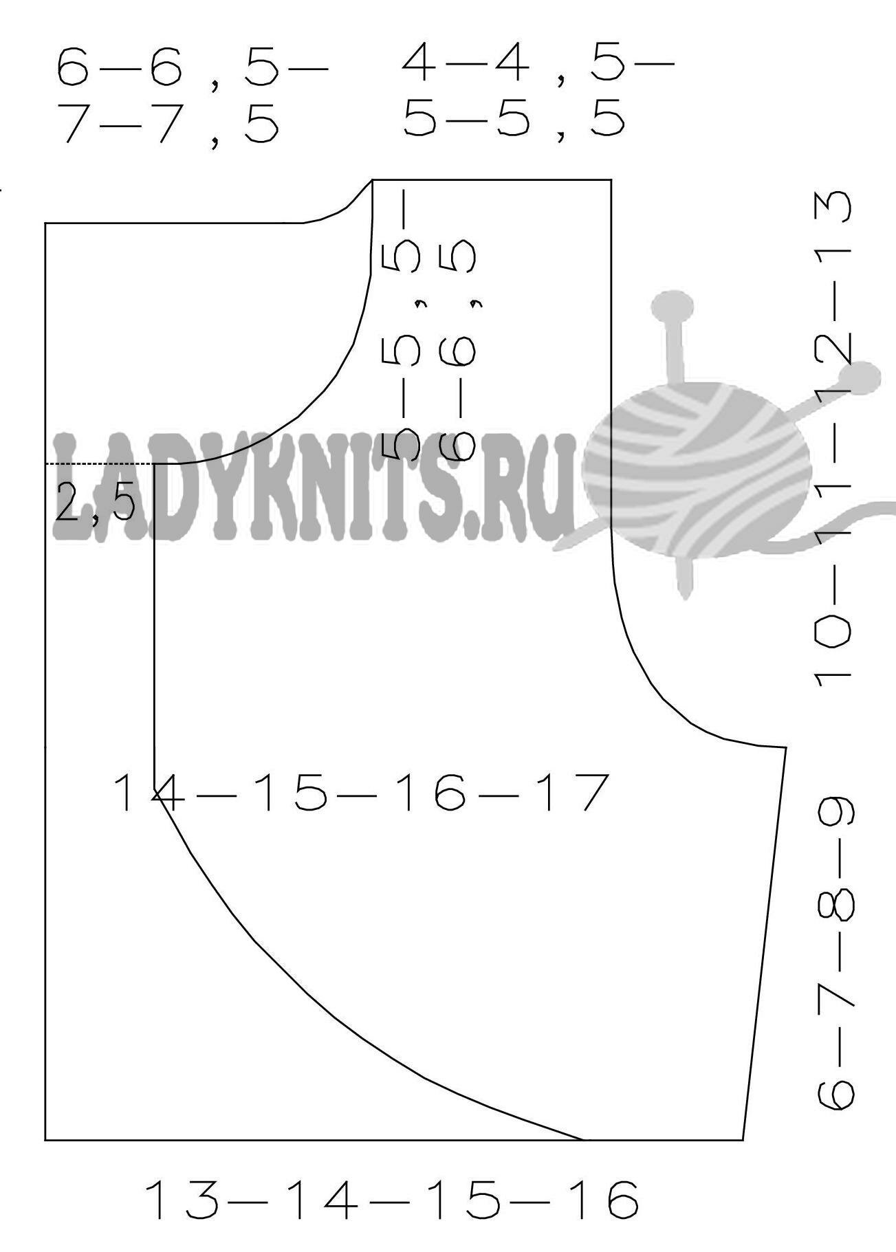 В передней части изделия рапорт повторяется между *, а петельки заканчивают после * № 2, но до «А». Спинка начинает вязаться с лицевой. Затем провязываются п., расположенные перед * № 1. Повторяется раппорт между * и заканчивается рядочек петлями, идущими после 2*, делаем 1 лиц.