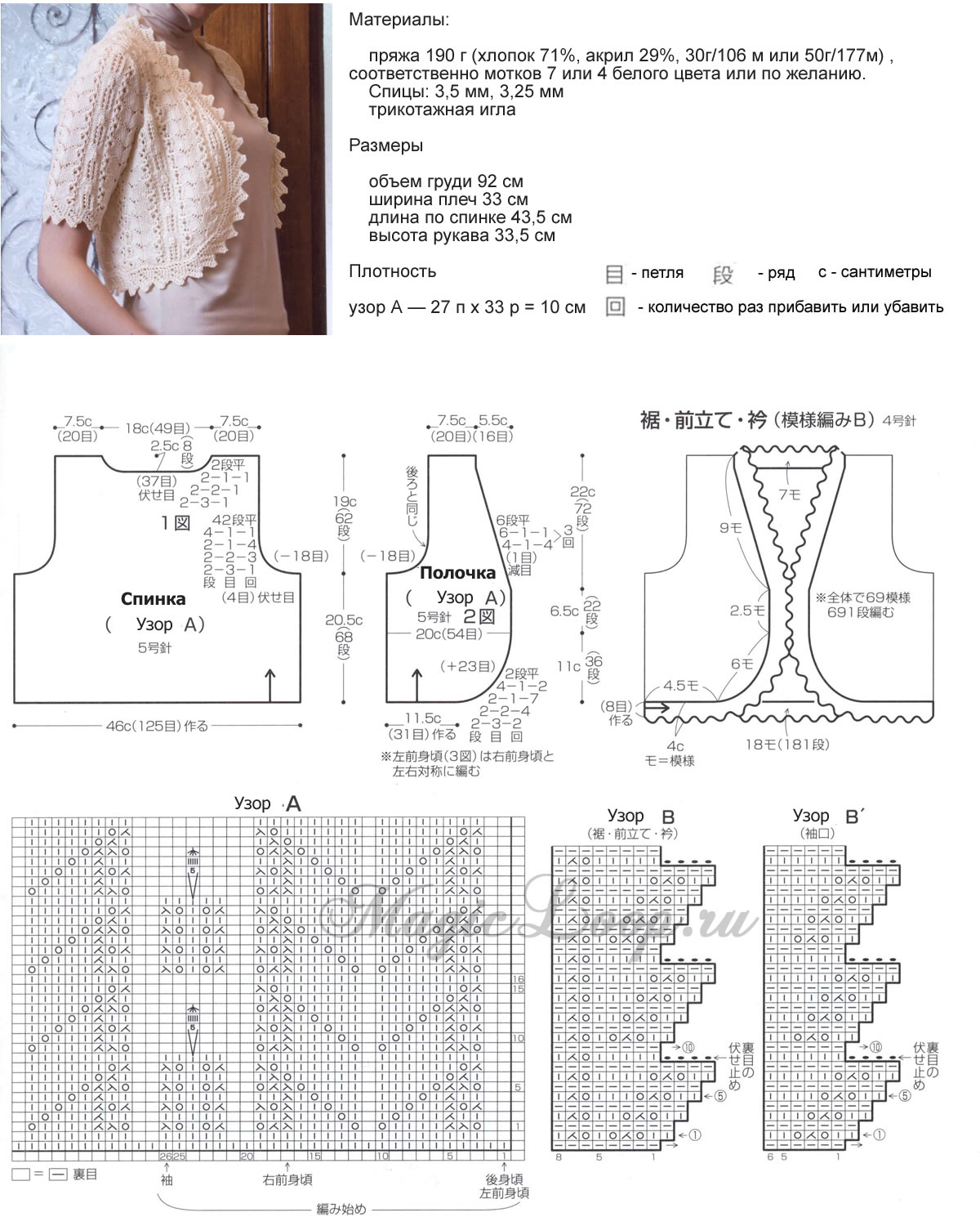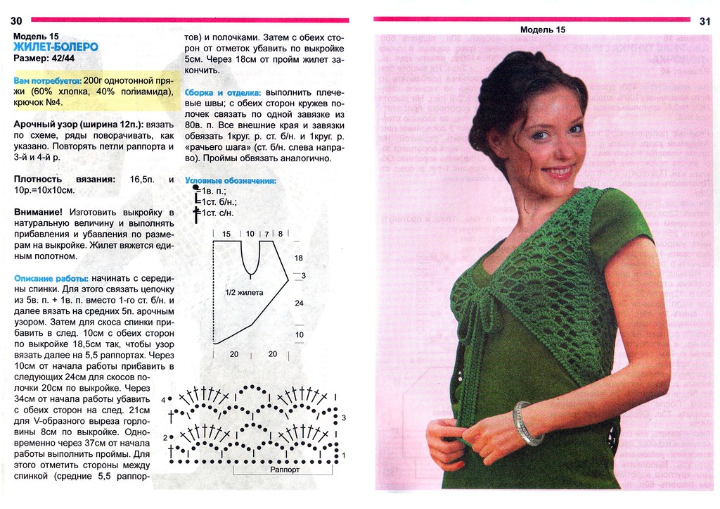 Плотность вязания этой модели составляет: 10 см=29 п. Раппорт рисунка в высоту = восемь р. Мастер-класс по вязанию летнего детского болеро. Наберите на спицы 124/128 петель для правой половины передней части изделия. Провяжите платочной вязкой 1/5 шт. Ажуром – 121 шт.