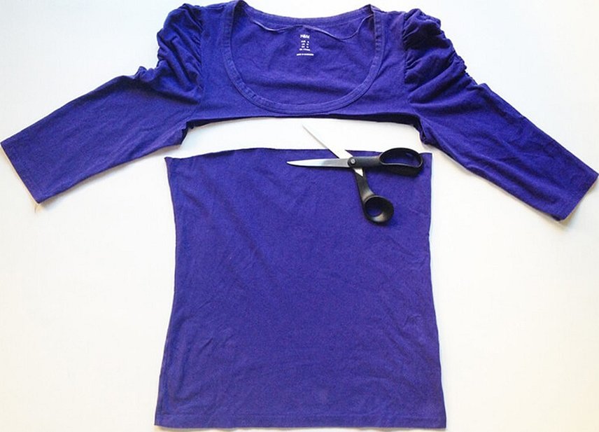 А также болеро можно сшить из ненужной футболки. По центру на лицевой стороне нужно сделать разрез, а также убрать воротник и обработать горловину.