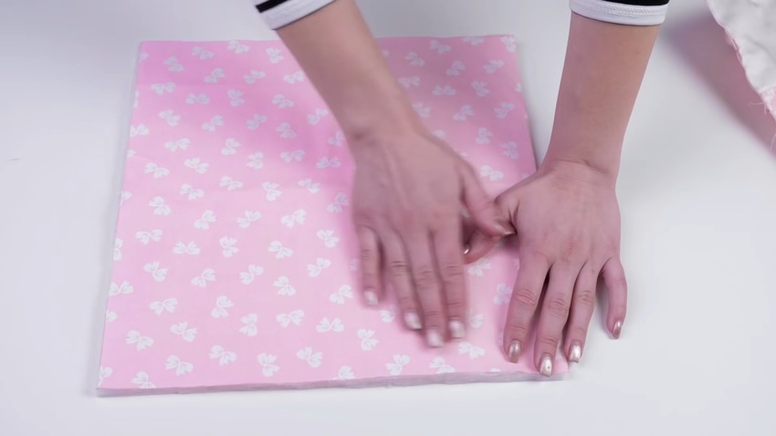 После того, как полотно из подушечек готово, вам нужно добавить нижнюю ткань. Для этого возьмите натуральный хлопчатобумажный материал. На ровной поверхности сложите слоями сначала нижнюю ткань лицевой стороной вниз, на нее полотно из подушечек лицевой стороной вверх.