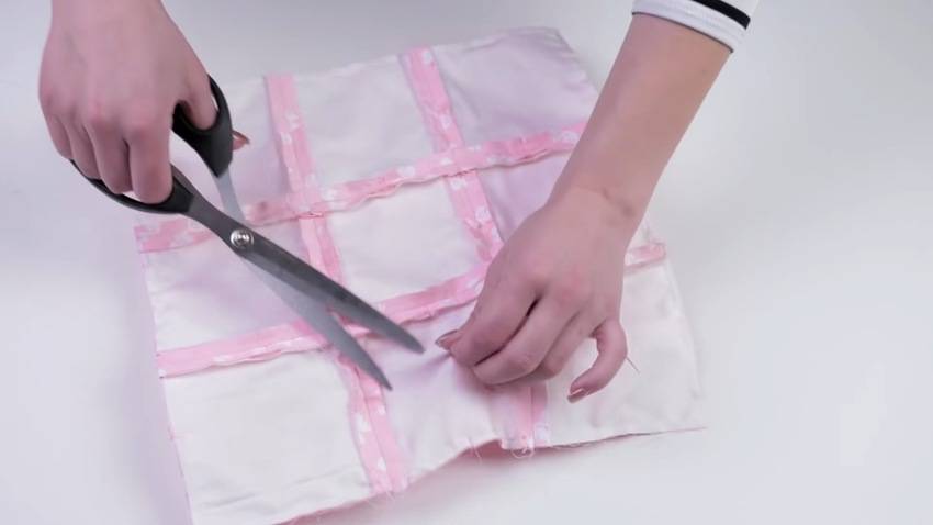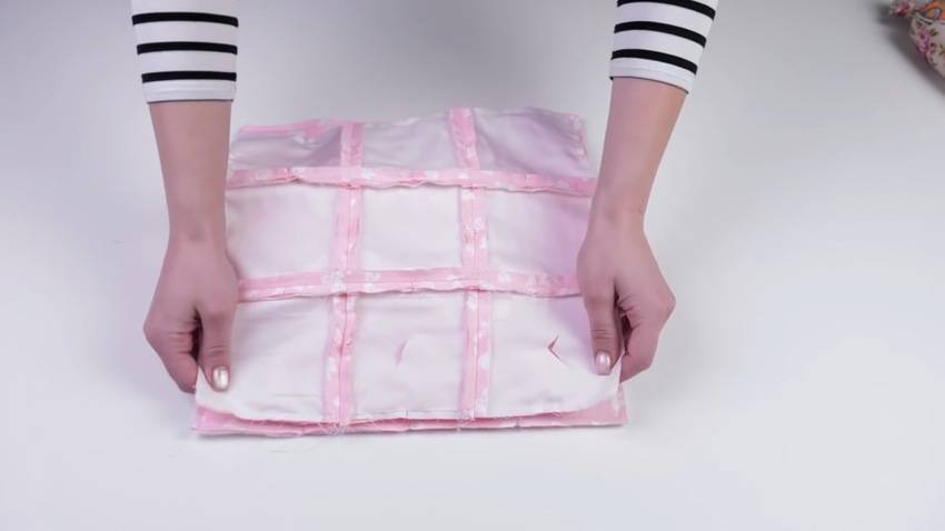 На ткани чертим прямоугольники или квадраты, затем прокладываем строчку по линиям и делаем складку посредине