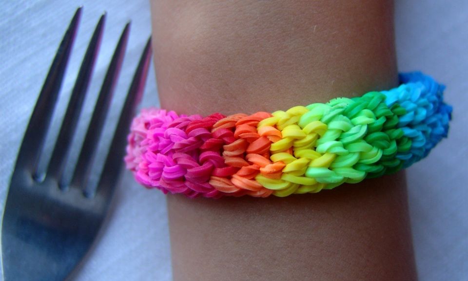 Работа над этим браслетом из больших резинок не требует специальных инструментов: вполне хватит пары вилок, кусочка скотча и стандартных пластиковых застежек-клипс. Также понадобятся разноцветные резинки: 13 фиолетовых, 16 синих, 12 голубых, 16 зеленых, 12 желтых, 16 оранжевых, 12 розовых и 16 красных — полная радуга.
