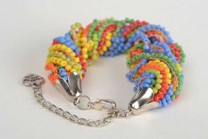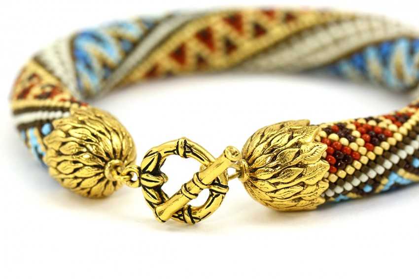 Такой крупный элемент лучше делать единым, без застежки. Чтобы плетение гармонично завершилось, последнее звено браслета должно быть из бисера, а фиксирующая его бусина относиться к первому кольцу украшения, с которого началась работа.