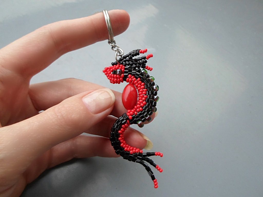 Проволоку закрепите, сделав по витку вокруг последней бисерины, и для надежности пропустите концы проволоки еще по нескольким бисеринам хвоста и только потом обрежьте. Брелок готов.