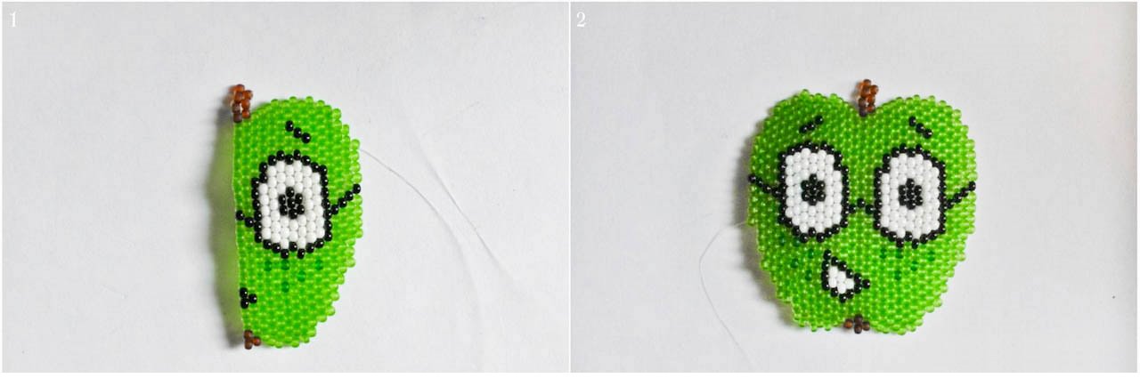 Если вы хотите сделать плоский брелок из бисера из одной детали, то используйте для его плетения проволоку. Тогда он будет плотнее. А если все же будете делать яблочко из двух частей, то тогда лучше делать его с помощью лески.