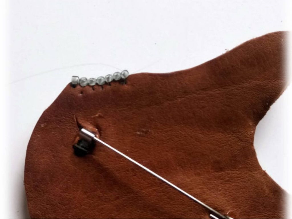 - В кожаном лоскуте делаем отверстие, вставляем булавку.