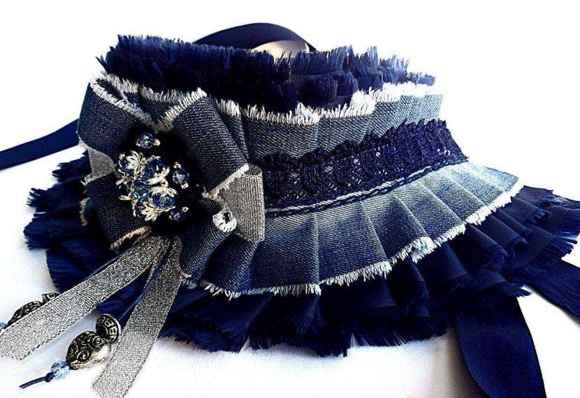 Из воротничка старой джинсовой рубашки, добавив фурнитуру и комбинируя различные материалы, можно сделать необычное праздничное ожерелье.