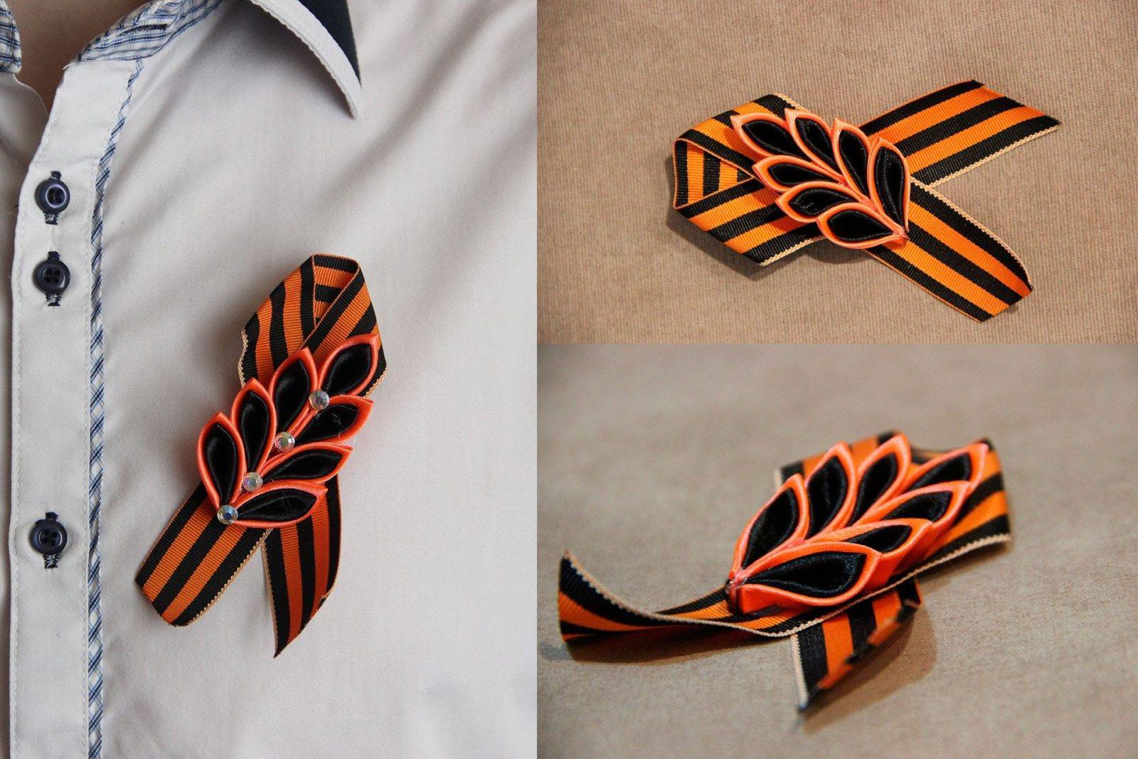 Двухслойные лепестки при помощи горячего клея или ниток можно соединять в виде оранжево-черного колоса в тон георгиевской ленте.