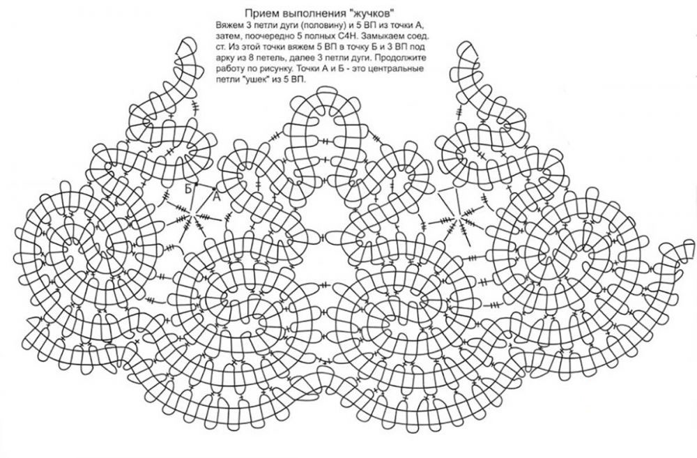 Вяжем 3 петли дуги (половину) и 5 воздушных петель из точки А, затем , поочерёдно 5 полных столбиков с 4-мя накидами. Замыкаем соединительным столбиком. Из этой точки вяжем 5 воздушных петель в точку Б и 3 воздушные петли под арку из 8 петель, далее 3 петли дуги. Продолжите работу по рисунку. Точки А и Б — это центральные петли «ушек» из 5 воздушных петель.