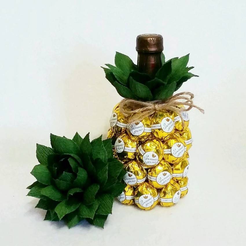 Если вы собрались в гости к закадычной подруге, то почему бы не прихватить с собой бутылочку шампанского. Но без вкусностей аперитив не пьют и это повод преподнести еще и оригинальный презент, оформленный по подобию ананаса.