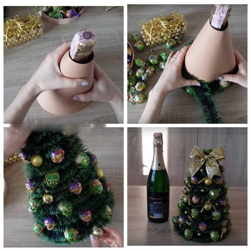На бутылку нанести силикон, на него посадить мишуру полосками (по направлению от горлышка к дну) или по спирали. Лишнее отрезать. Затем приклеить поверх мишуры шоколадки. Дополнительно можно украсить бантиками из атласных лент. Новогодний букет с шампанским мгновенно поднимет настроение.