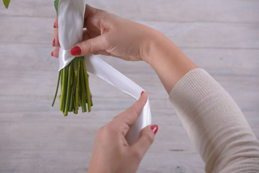 Затем положите один конец поверх цветов, а другой оберните вокруг стеблей. Оставьте примерно 40 см на конце, чтобы завязать узел и добавить бант.