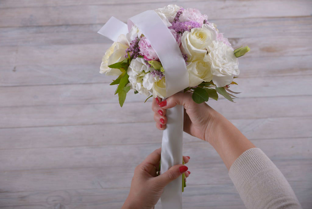 Лучше всего выбирать для подобных композиций растения с прямыми, но довольно гибкими стеблями. Впрочем, вам в любом случае предстоит зафиксировать ножку флористической проволокой. При желании ножка заменяется портбукетницей. Сверху добавляем тщательно подобранный под флористическую композицию, наряд и стиль свадьбы декор – атласную ленту, отрез шифоновой ткани, кружево.