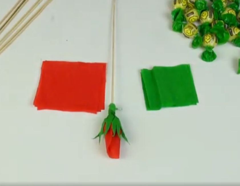 Берем каждый лепесток и, придерживая пальцами с двух сторон, растягиваем так, чтобы в середине образовалась неглубокая впадина. В один лепесточек вкладываем нашу конфету, оборачиваем вторым, а затем нитками приматываем всё к шпажке.