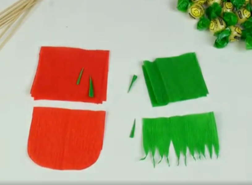 - Из зеленой гофре сделайте фантики 7×7 см.