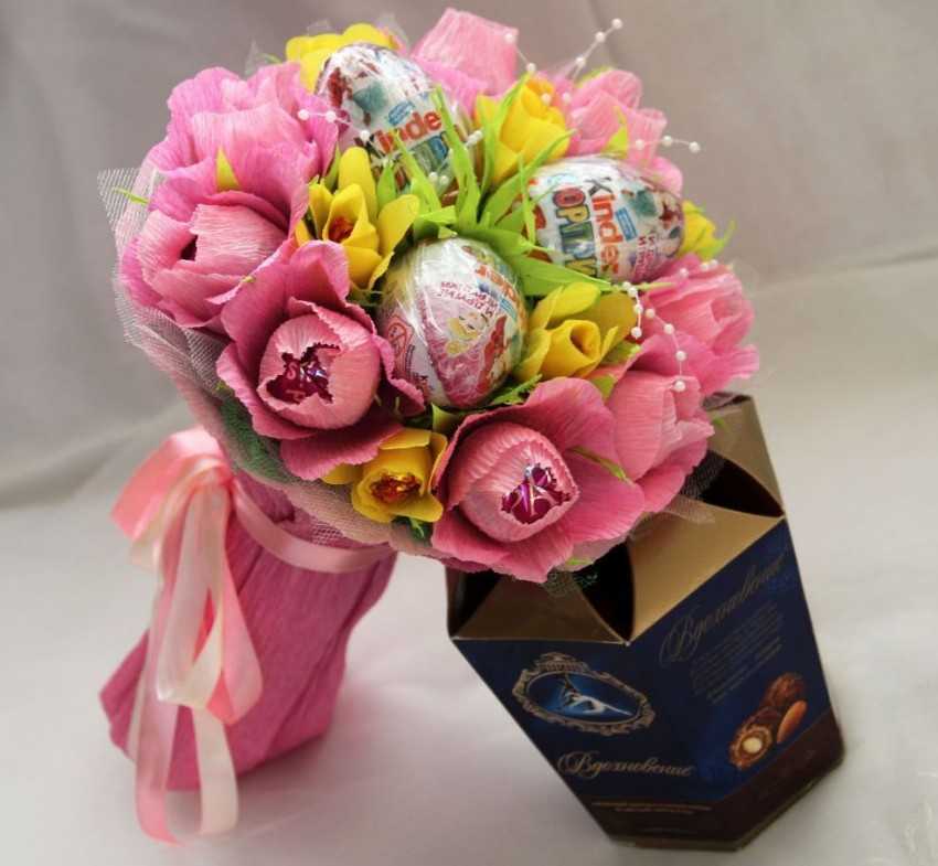 Одними из первых весенних цветов считаются тюльпаны. Поэтому красивый букет из тюльпанов с конфетами может стать оригинальным подарком на 8 марта или день рождения.