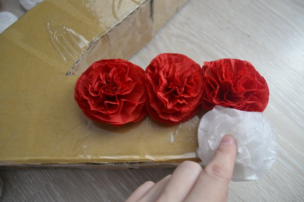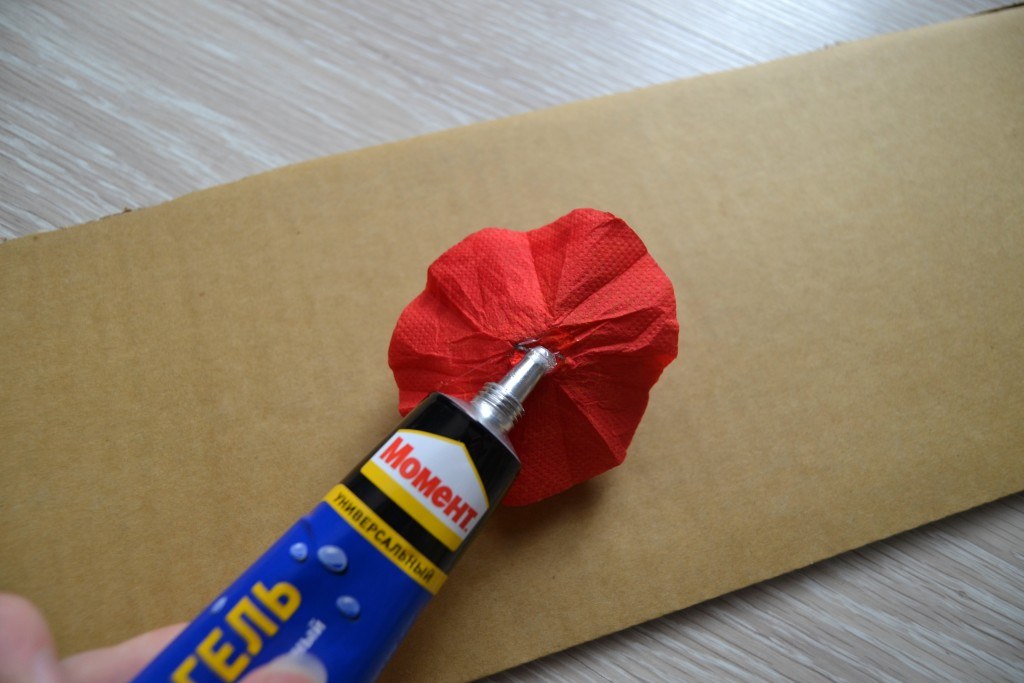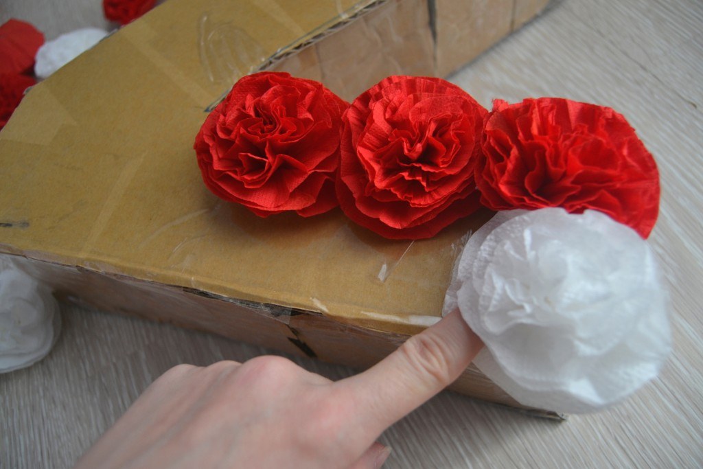 Приклеиваем цветы на картонный каркас с помощью клея.