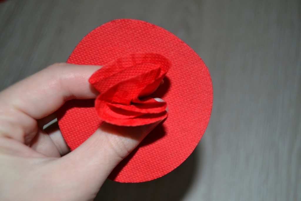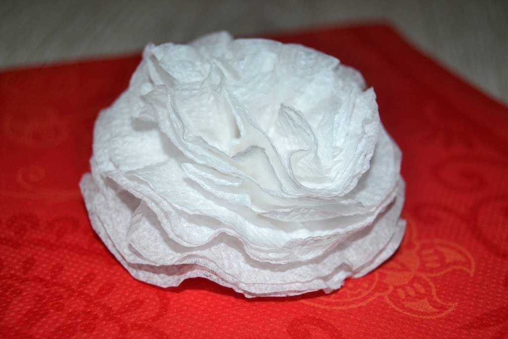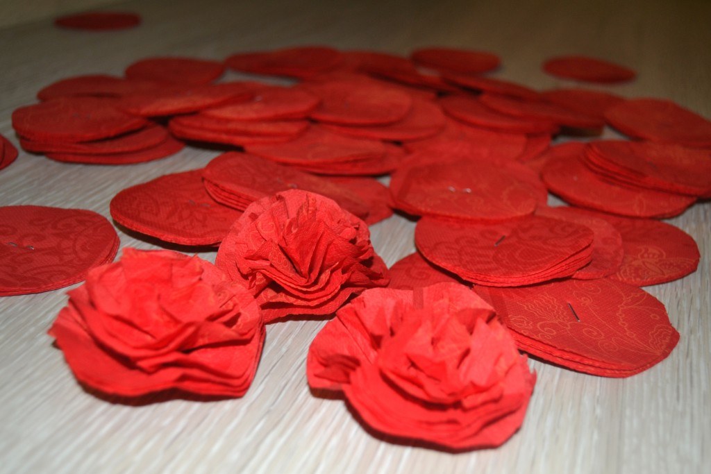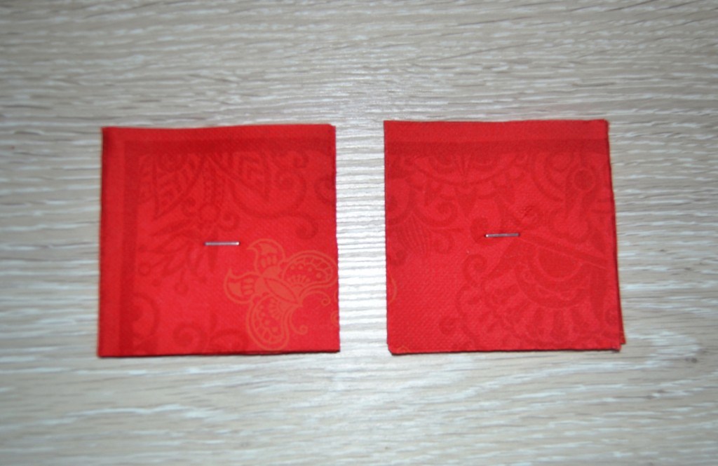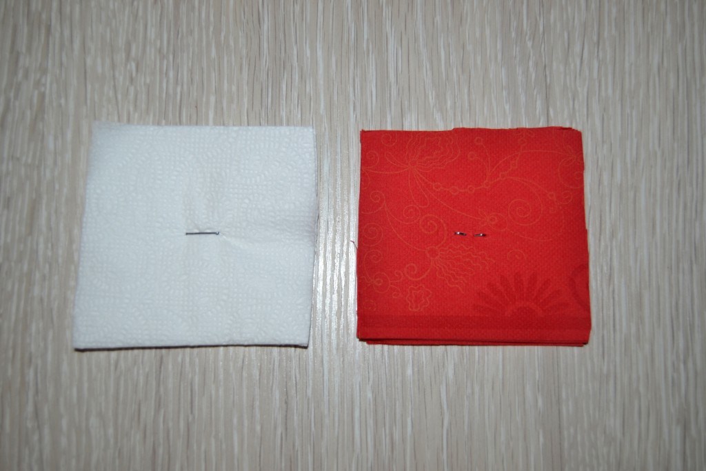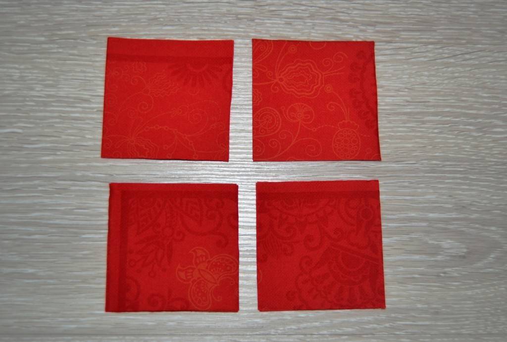 Из салфеток белого цвета делаем такие же заготовки. В данном случае они немного больше по размеру, поэтому обрезаем их, чтобы они стали такими же, как красные.