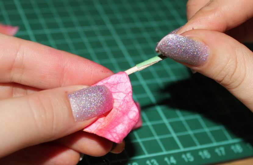 - Один из краев каждого лепестка накручиваем на зубочистку. Противоположный край закручиваем в другую сторону, перевернув заготовку.