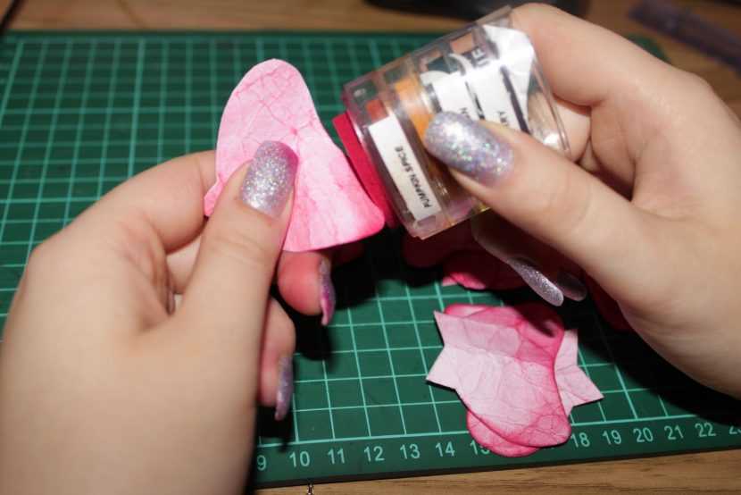 - Края лепестков тонируем чернилами или краской, смочив ими губку. Дожидаемся высыхания.