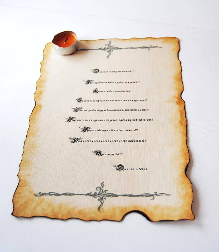 С помощью простой свечи можно красиво состарить бумагу, придав ей вид старинного свитка. Используя данную методику, нужно позаботиться о противопожарной безопасности. Работу лучше всего проводить над раковиной. Установим свечку на подсвечнике и поджигаем. Над огнем начинаем водить листом бумаги на расстоянии не менее чем 10 сантиметров. Нельзя задерживать лист на одном месте, иначе получится дырка. За несколько минут, словно по волшебству, мы состарим бумагу на несколько сот лет.