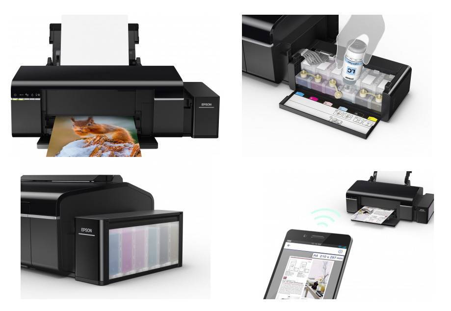 Epson L805 — 6-цветный фотопринтер со встроенными емкостями для чернил вместо картриджей, с поддержкой беспроводного подключения по Wi-Fi и печатью с мобильных устройств.