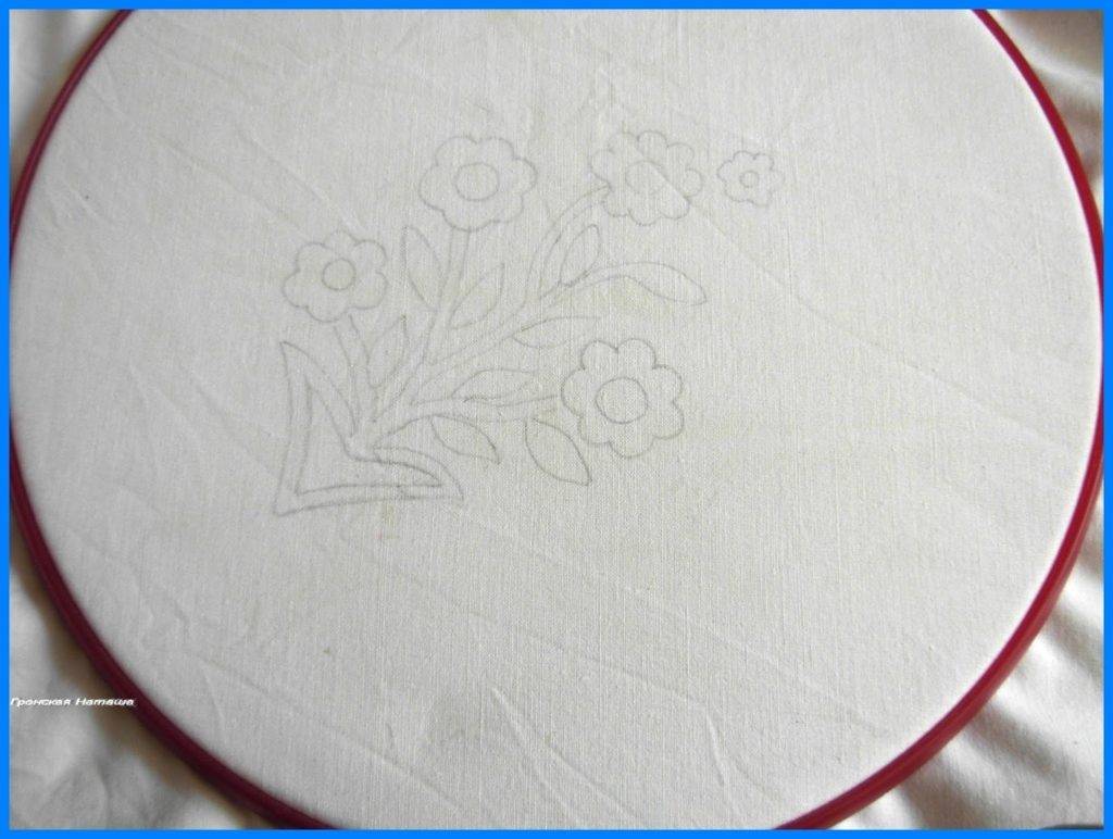 3. После нанесения узоров, сложите два слоя материала вместе и заправьте, натянув на пяльцы.