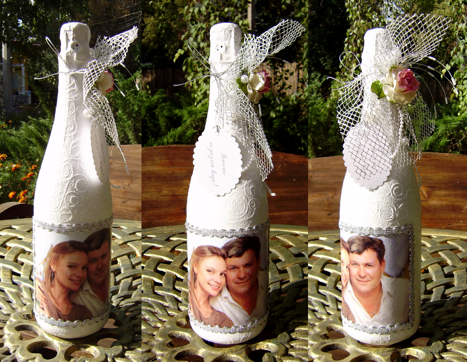 Оформление бутылки шампанского декором с элементами декупажа