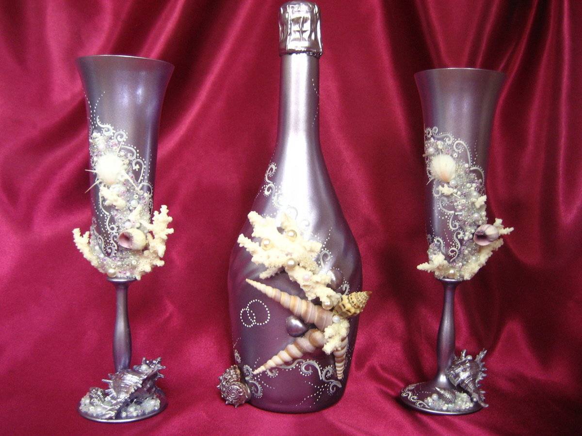 Идеи украшения не ограничиваются приведенным списком. Всегда можно придумать что-то свое или соединить несколько разных техник. Чтобы работа выглядела аккуратно, а композиция не стала распадаться в самый ответственный момент, декор свадебных бутылок начинают с тщательной подготовки поверхности: