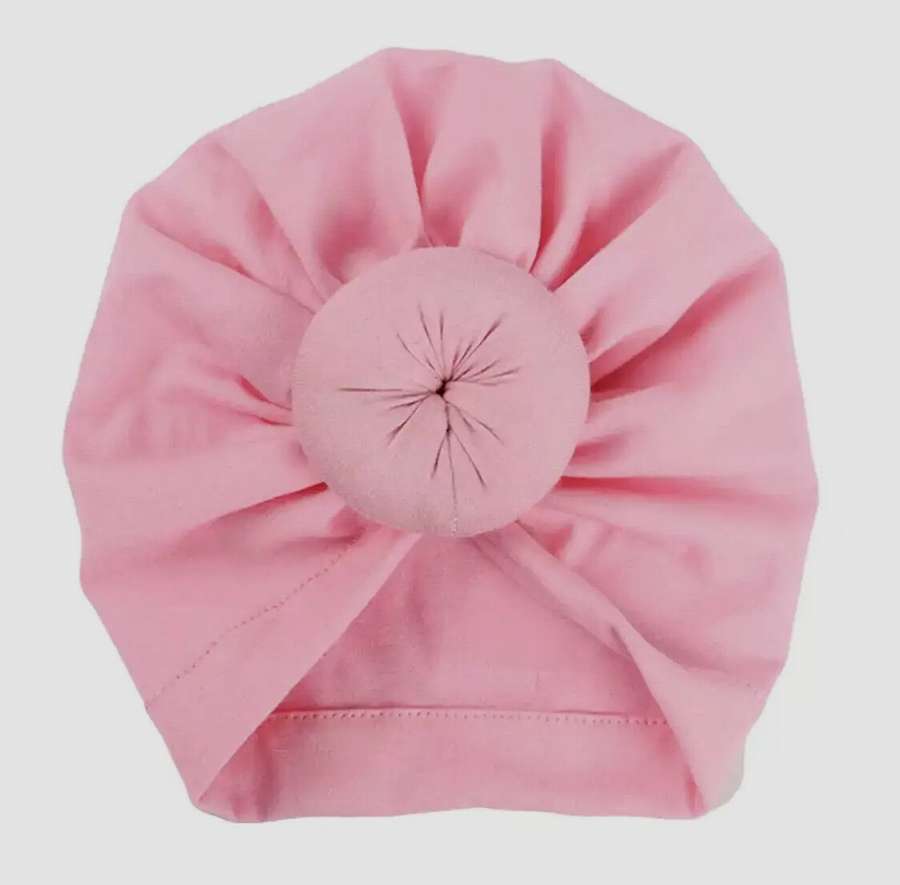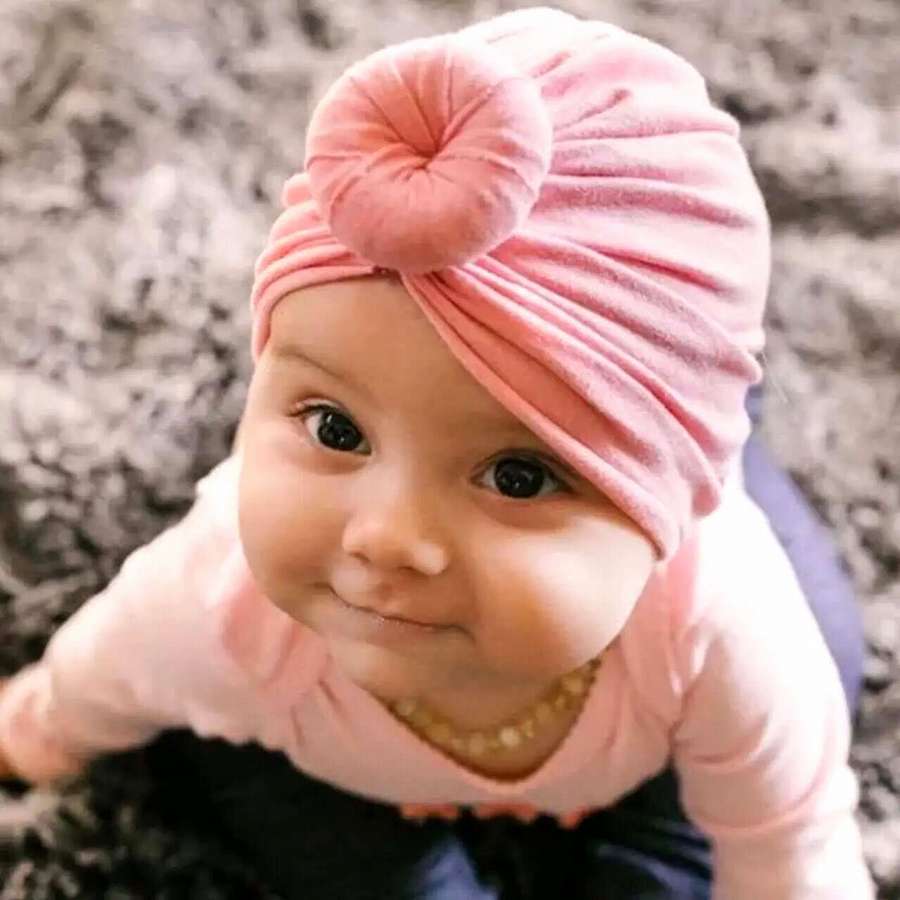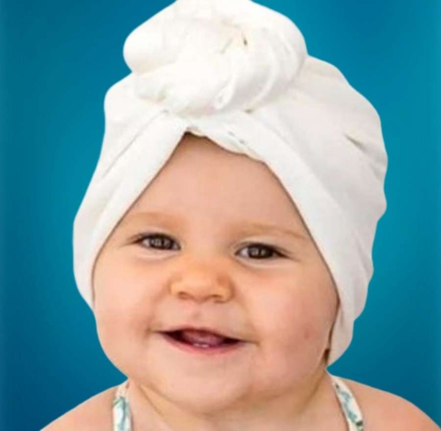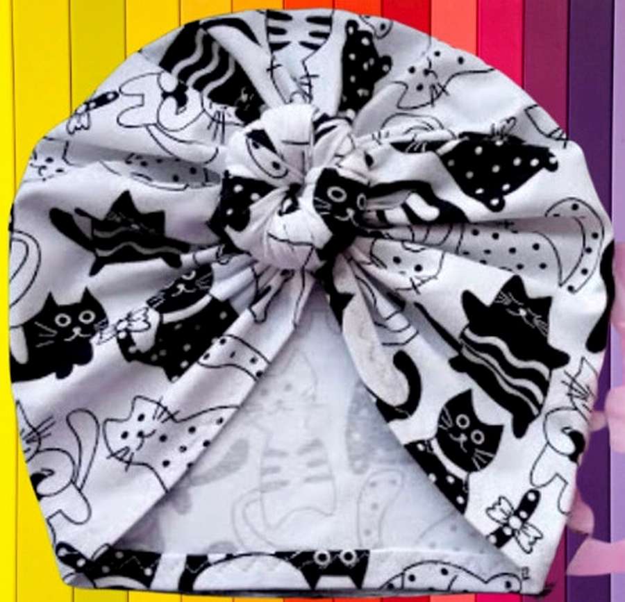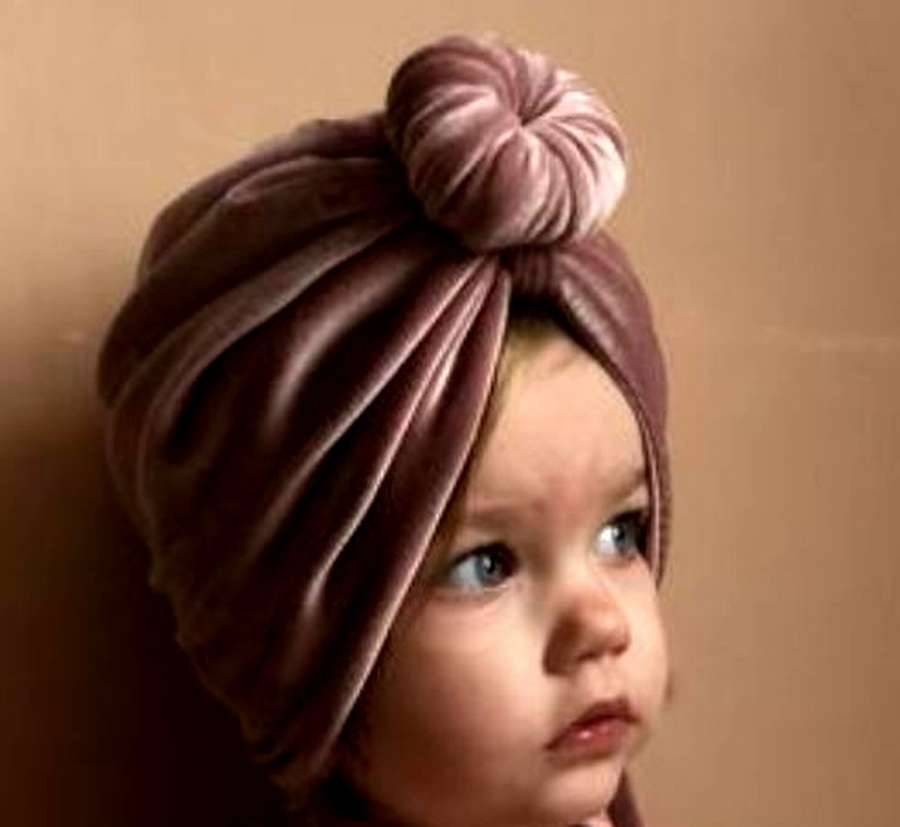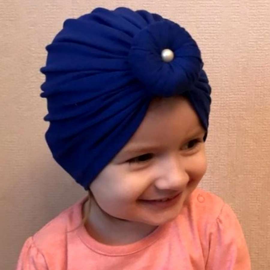 Тюрбан этой маленькой модницы сшит на машинке, это шапочка в виде тюрбана, которая надевается именно как шапочка. То есть отрез материи не приходится складывать и завязывать каждый раз.