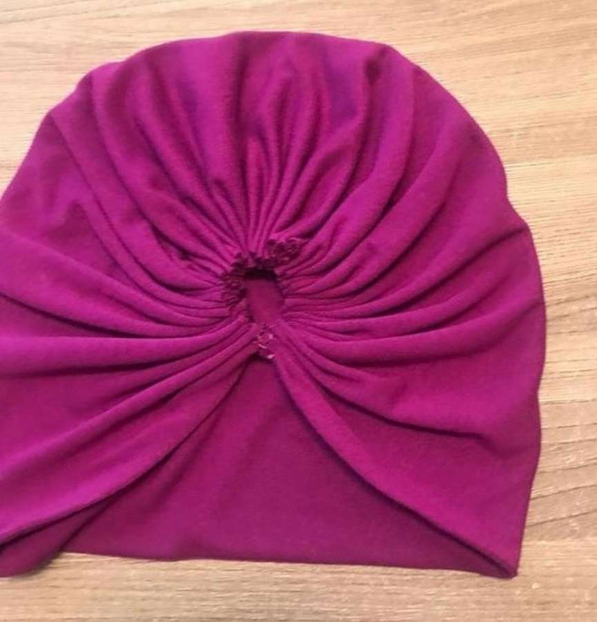 Момент пошива тюрбана с бубликом своими руками. Будущий тюрбан стянут сметочной строчкой. Можно украшать хоть бубликом, хоть пончиком, цветком, бантиком и чем угодно.