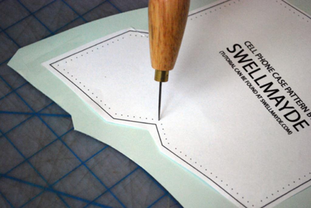 Для большей надежности изделия, склеенные боковые стороны необходимо еще и сжить. Чтобы стежки были ровными, используйте линейку и шило. Приложите линейку к боковой стороне, отступив от края не более 3 мм. Сделайте шилом отверстия в коже через каждые два деления, начиная от верха чехла.