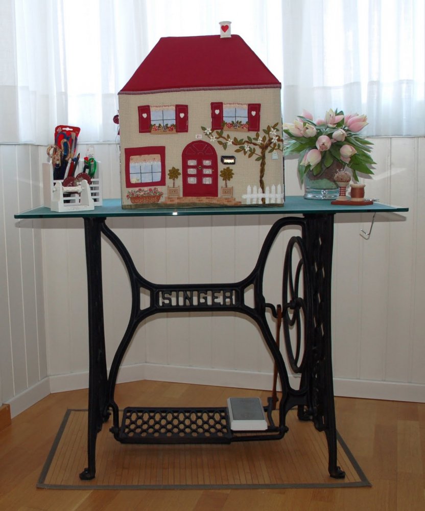 Швейная машинка вполне может стать еще и оригинальным предметом интерьера, если чехол на неё оформить в виде милого домика.