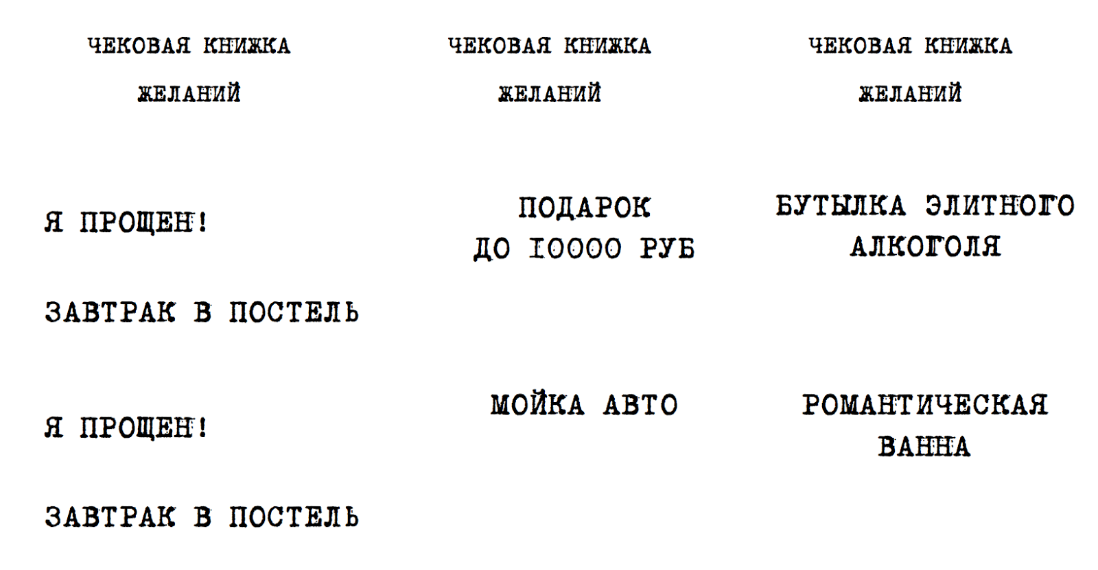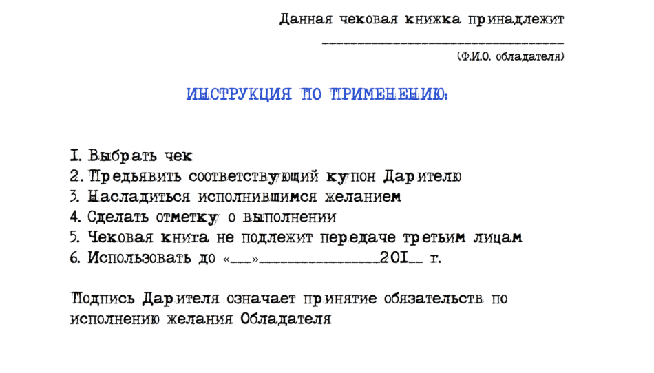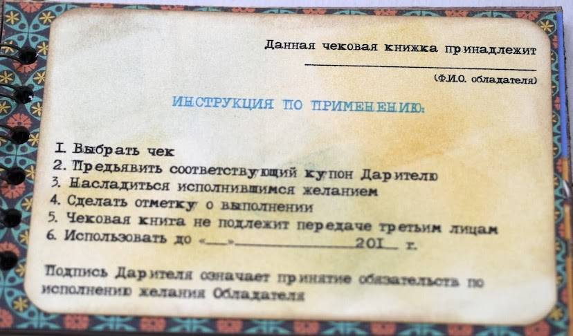 компактность (формат, как правило, А 6); презент строго именной; количество страничек-чеков символическое (по числу лет именинника, важной дате, просто магическое число — 7, 9, 13); ограничена определенным сроком действия; изюминка не в подарочном декоре, а в тексте; сопровождается инструкцией по применению; чеки предъявляет только хозяин книжки, исполнять их должен лично даритель, без делегирования полномочий; тему каждого разворота нередко поддерживают клипарты. С обложкой и формой вроде ясно, а как же она устроена внутри? Инструкция по применению:. С обложкой и формой вроде ясно, а как же она устроена внутри? Инструкция по применению: