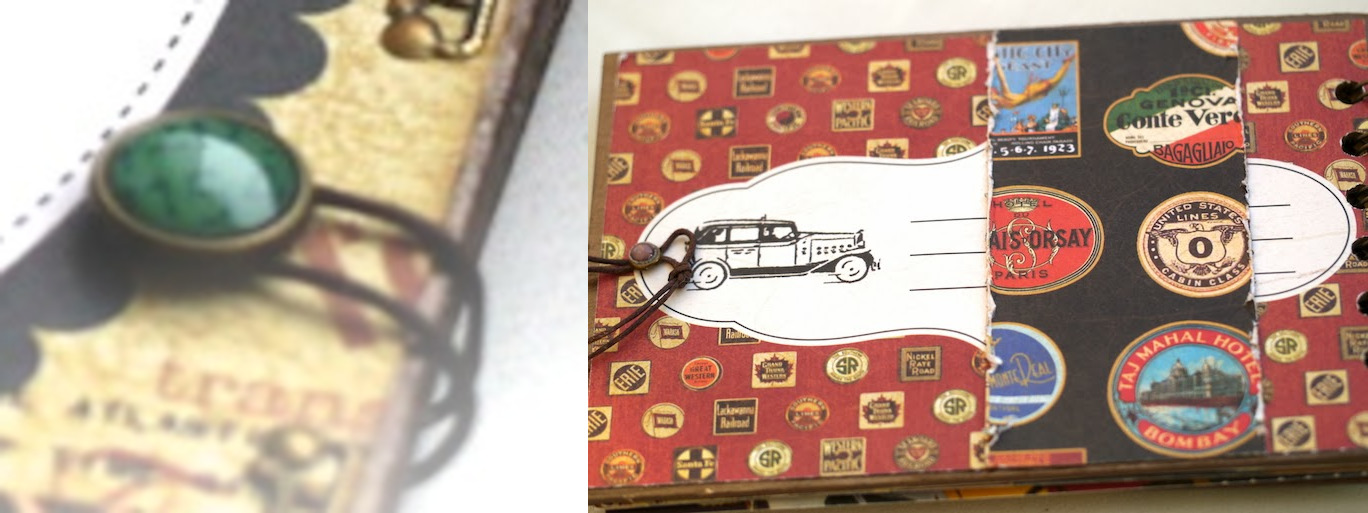 Вторая картонка, которую мы оформляем — нахзац и последняя страница чековой книжки. Также отступив от края 1.5-2 см крепим брадс поменьше и на него крепим вощеный шнур таким образом, чтобы можно было закрыть чековую книжку. После этого брадс максимально плотно вдавливаем в картон.