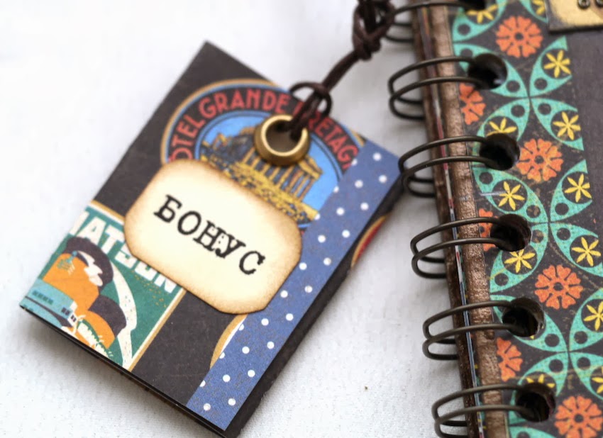 Второй бонус тоже делается очень легко. Возьмите полоску бумаги и сложите ее втрое. Внутрь приклейте ЖЕЛАНИЕ. Хорошо сложите и прогладьте сгибы. Поставьте люверс, который будет надежно держать закрытым книжечку и приклейте слово БОНУС: