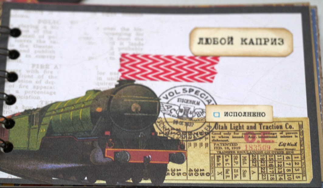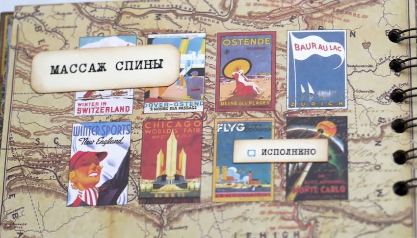 Далее нарезаем желания и отметки о выполнении, скругляем края, тонируем их и приступаем к оформлению внутренних страничек. Здесь вы можете вволю проявить свою фантазию — обыграть тему желания, используя подходящие штампы, клипарты, афоризмы, стихи, элементы. Не забудьте только приклеить само желание и надпись о его выполнении.