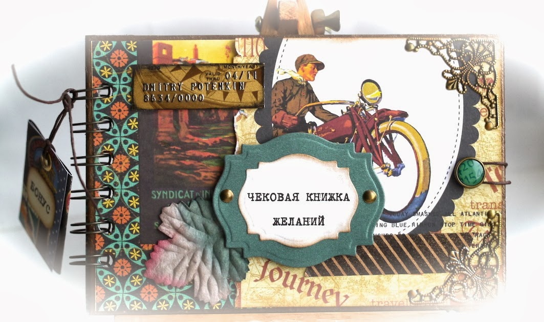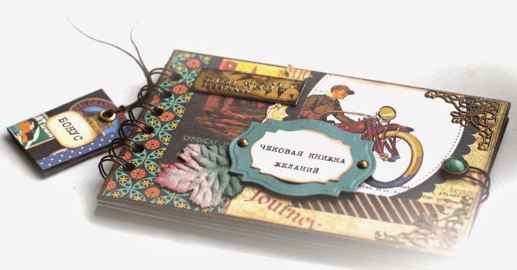 Итак, сегодня у нас вариант оо-очень быстрой, даже скоростной Чековой книжки! Главный секрет — использование твердого картона, толщиной 2 мм, для основы крышки и оптимально подходящей под принцип «Отрежь и приклей!» скрап-бумаги. Чтобы меньше пришлось клеить, выбирайте плотную двустороннюю бумагу.