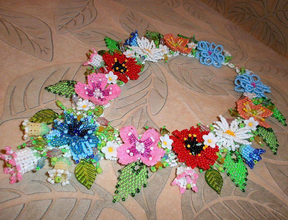 Объемные колье с цветами. Количество и размер цветов бывает различным. Если все элементы колье выполнены в одной цветовой гамме, как правило, в таких колье присутствует один крупный цветок, то оно выглядит строго и стильно. В том случае ( как на фото), если в колье вплетены зелень и различные яркие цветы, оно больше походит на яркий летний венок. Стиль такого колье, скорее всего, подойдет к однотонному легкому платью в постельных тонах или простому костюму из летней ткани свободного покроя. Такая работа относится к классу повышенной сложности. Для его создания потребуются подробные схемы с описанием: схемы плетения разных элементов и схема соединения их между собой.