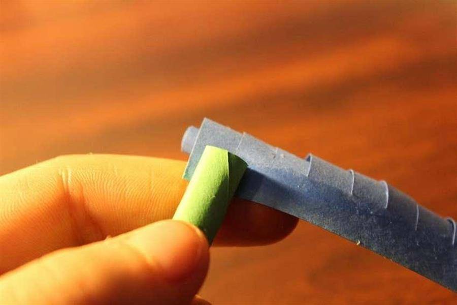 - Из двух полос зеленой бумаги вырезаем лепестки и немного растягиваем их для придания нужной формы.
