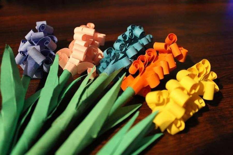 Из зеленой бумаги делаем чашелистик для каждого бутона и приклеиваем к стеблю длинные листки. Так же делаем все остальные цветы.