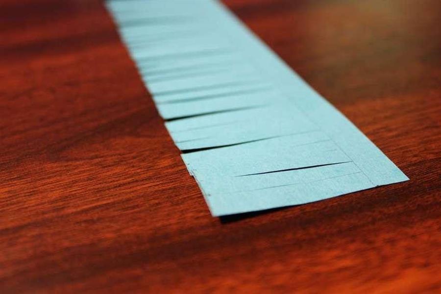 - Каждую сложить вчетверо по длине и ножницами сделать бахрому по линии сгиба. У края листа оставить примерно сантиметр.