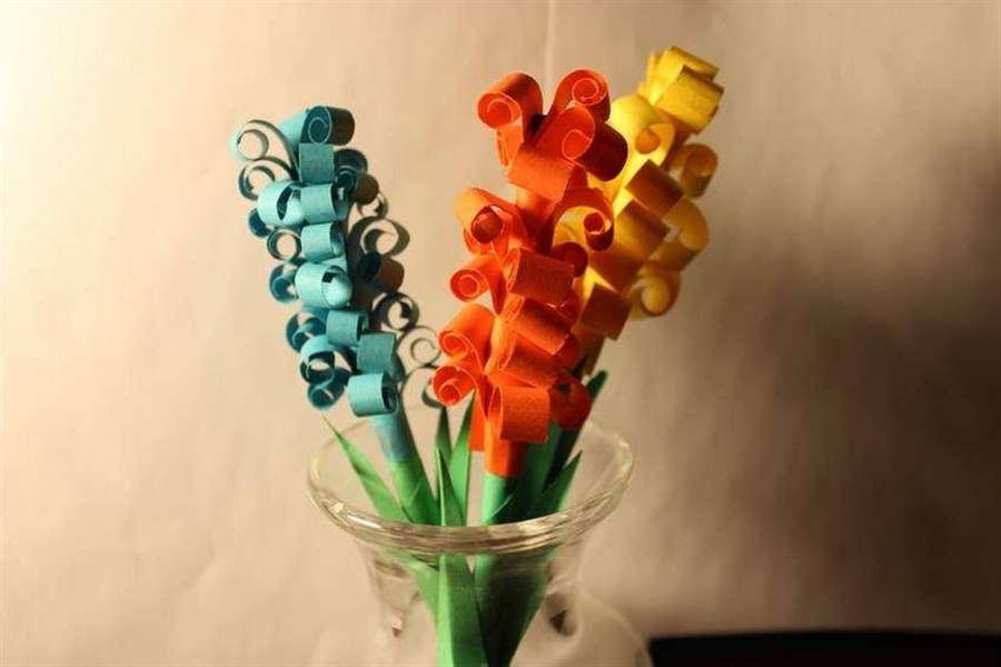 К примеру, чтобы сделать вот такие необычные цветы, понадобится цветная бумага, клей, ножницы, ватная палочка, карандаш и линейка.