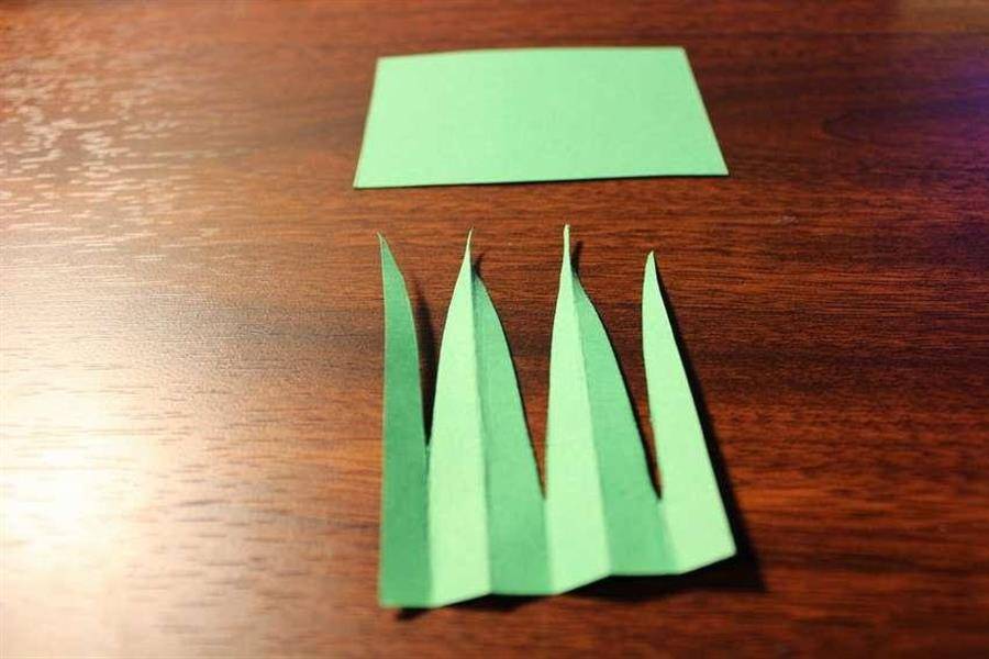 Берем бумагу зеленого цвета и линуем, как на картинке (полоски длиной 7 см и шириной в 10мм). Разрезаем до линии и крепим края при помощи клея. Все. Первый этап готов, мы сделали травку!