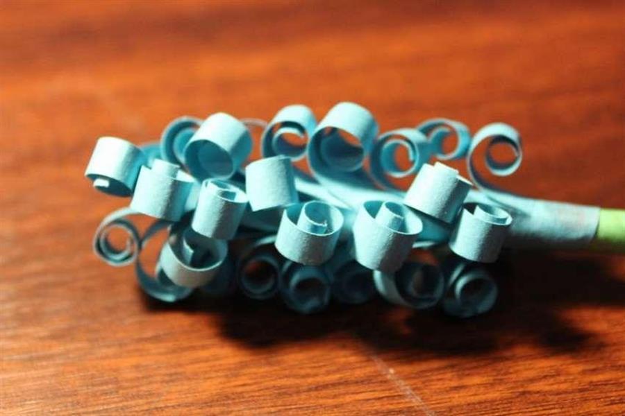 Продолжайте скручивание до конца полоски. Раздвиньте скрученный цветок, чтобы он стал более объемным и похожим на настоящий цветок. После того как у вас будет несколько цветов, возьмите зеленую гофрированную бумагу и вырежьте несколько листьев разных форм и размеров.
