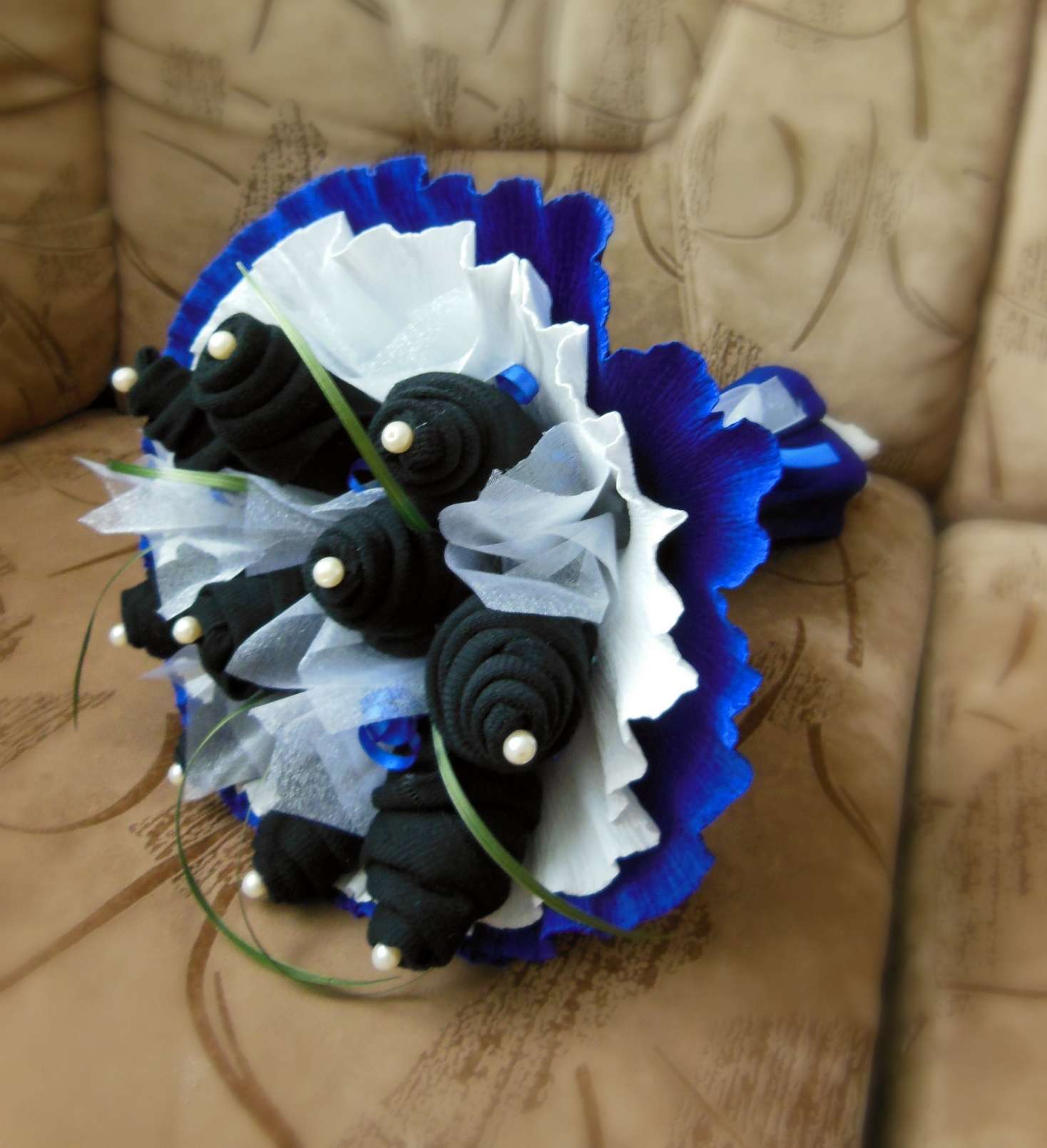 Декорируем бутоны атласными лентами, лепестками из гофрированной бумаги. Внутрь бутонов можно вставить бусины или конфеты.