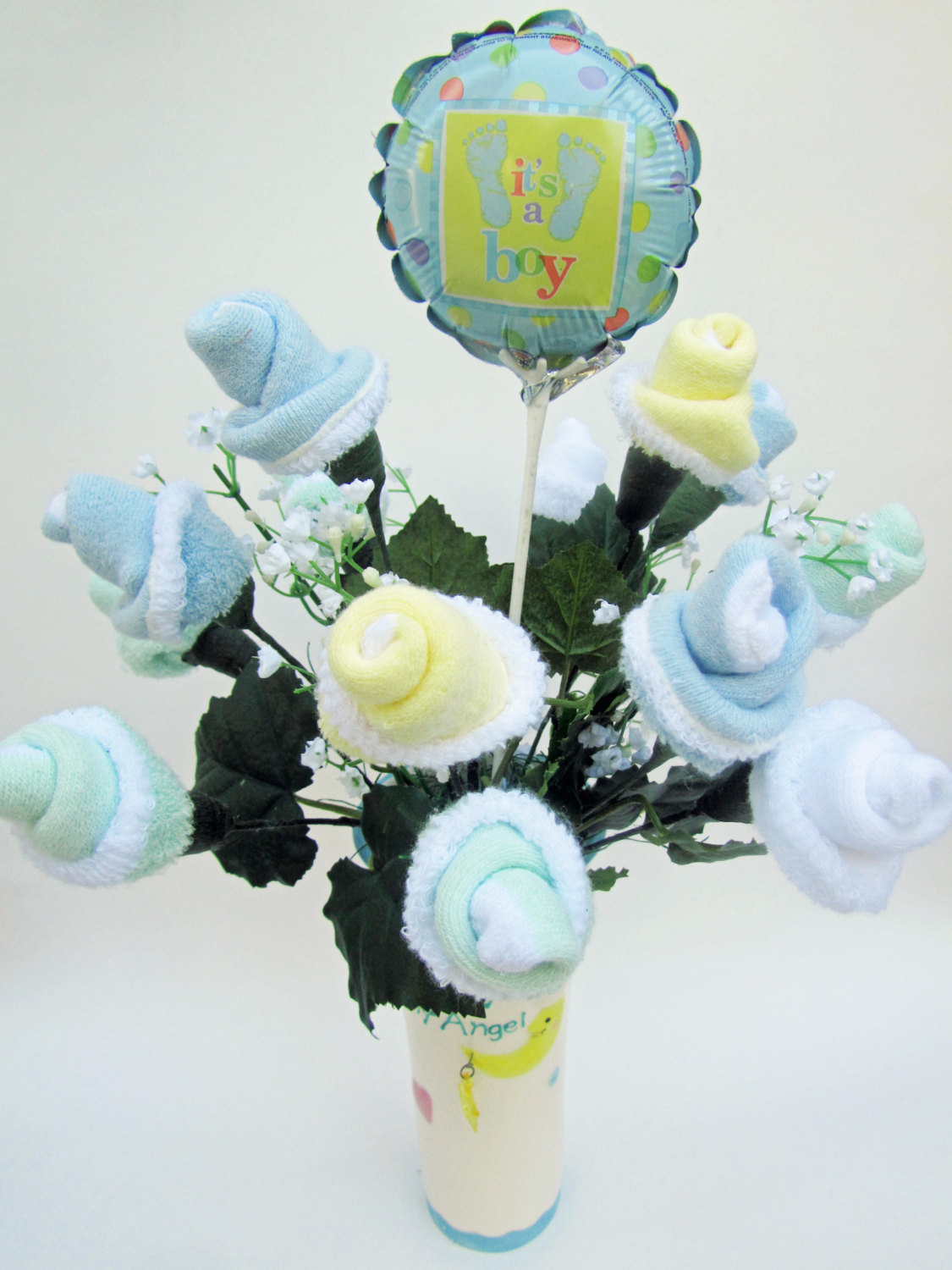 - Детские носочки сами по себе очень трогательные и милые, а уж собранные в букет – и подавно! Совсем крохе, кроме носочков, вряд ли стоит вкладывать в букет что-то еще, разве что украсить его лентами, поскольку красоту подношения оценит мама, которой вы и будете его вручать.