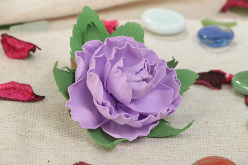 Такую лилию можно приклеивать к открытке на восьмое марта любимой женщине, сестре, маме. Также поделки из фоамирана отлично подойдут к заколке или на ободок для волос. Закрепим такую лилию на заколку вместо длинного стебля, прикрутим тоненькими проволоками шпильку. А водяные цветочки проще приклеить по кругу ободка.