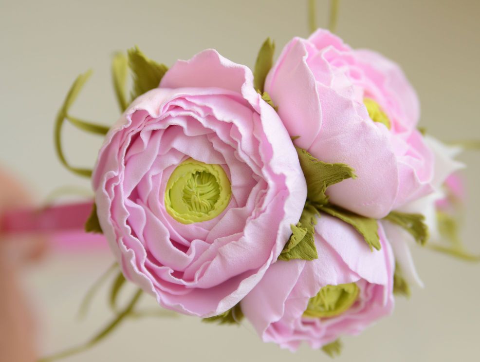 - Каждый элемент цветка тщательно обрабатывают, придавая нужную форму, фактуру и объем. Для этого используют техники нагрева, растягивания, перетирания и т. п. С помощью молдов и прочих специальных приспособлений формируют изгибы и близкие к естественным рисунки прожилок.