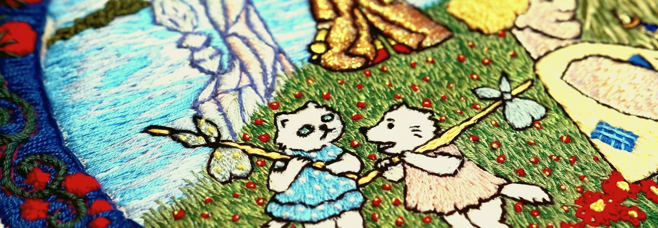 Гладью вышивают не только крупные участки рисунка, но и небольшие фрагменты, например, цветочные стебельки или длинные ленточки с бантиками.